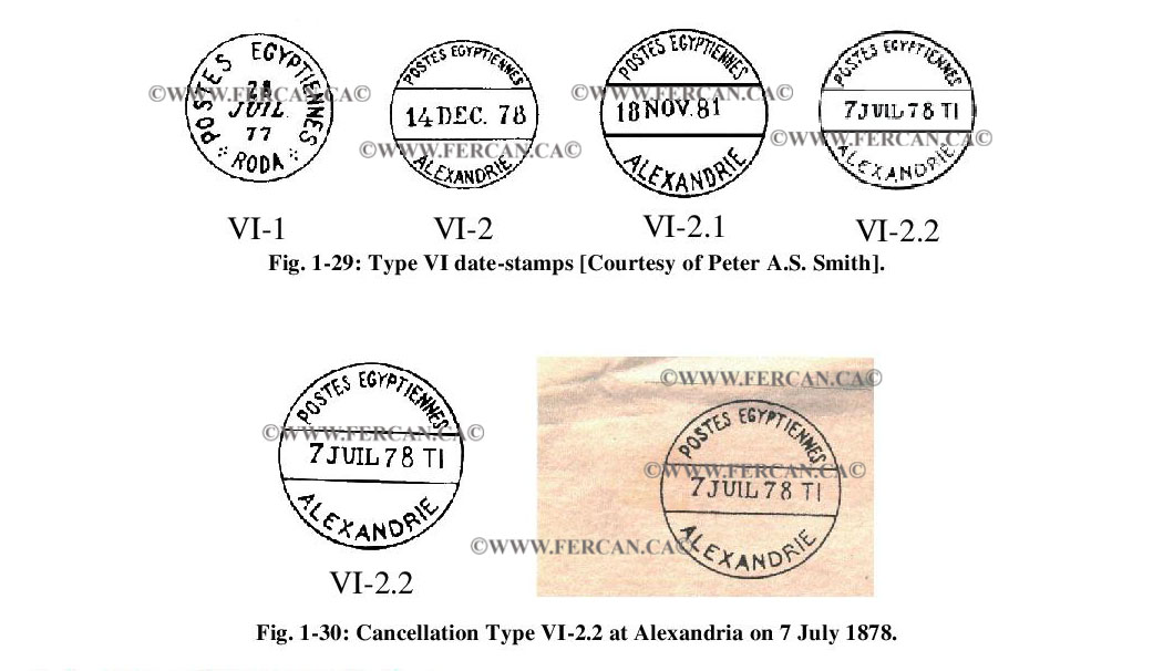 This sixth type of cancellation is distinguished from other date-stamps by the emergence of the French language inscription POSTES EGYPTIENNES. It signaled a shift from the use of Italian to that of French at post offices in Egypt. They were used only in Alexandria, Helwan, Roda and Suez between 1877 and 1881. The diameters range from 22.5 mm to 26.5 mm.