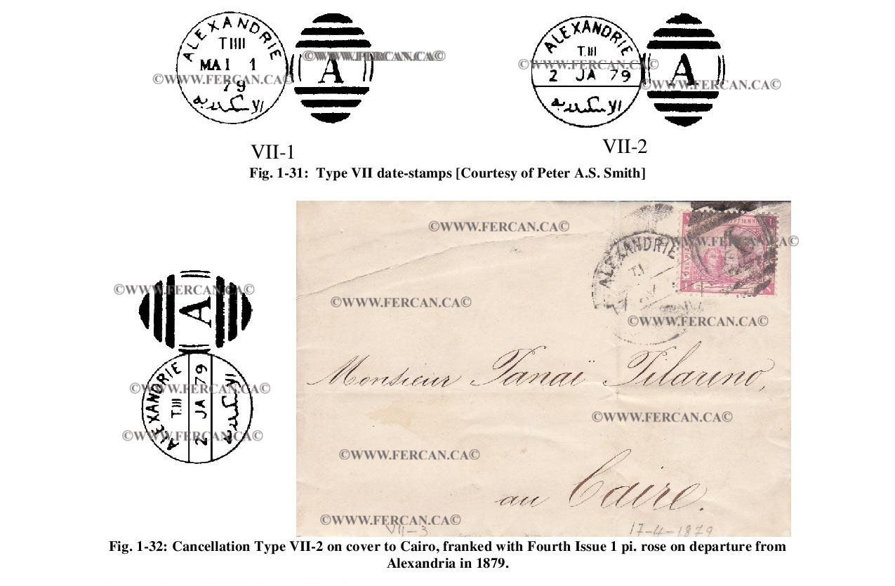 This seventh type of cancellation is distinguished by the emergence of Arabic and French. These seals were used experimentally only in Alexandria in 1878. Their diameter was 26.5 mm.