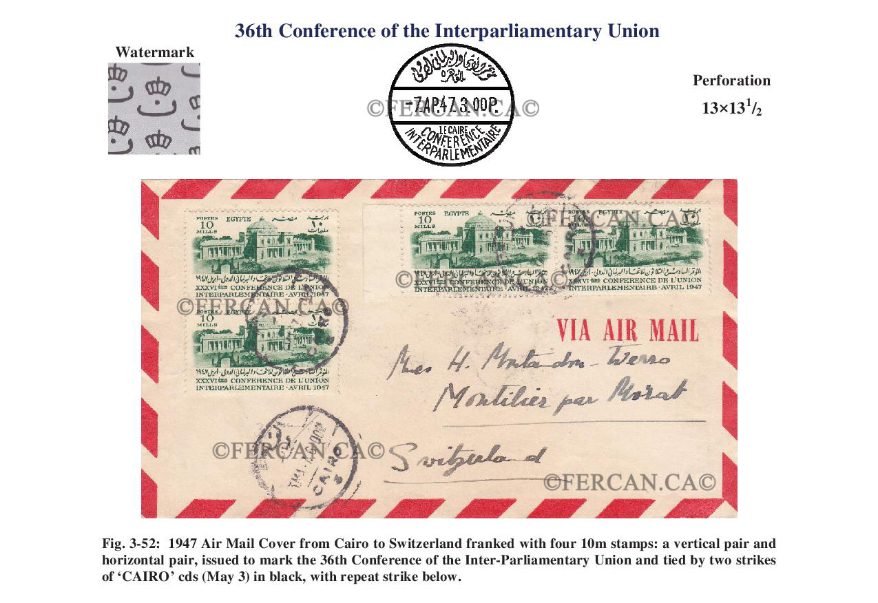 7 April 1947 - 36th Conference of the Inter-Parliamentary Union, held in Cairo. Photogravure by the Survey Department, Cairo. Usage valid until 6th August 1947.