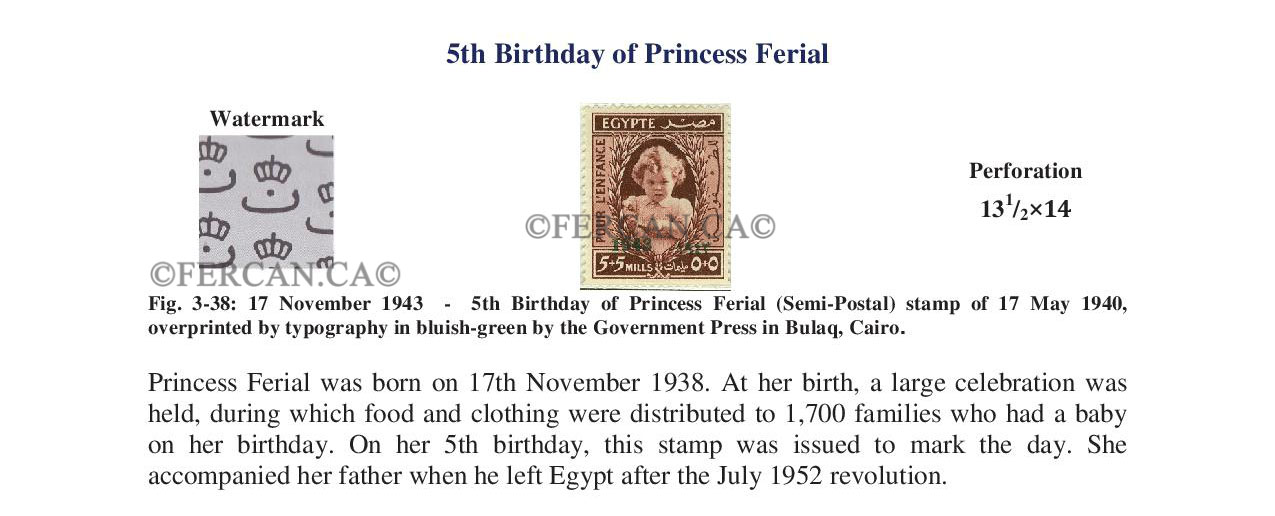 Princess Ferial was born on 17th November 1938. At her birth, a large celebration was held, during which food and clothing were distributed to 1,700 families who had a baby on her birthday. On her 5th birthday, this stamp was issued to mark the day. She accompanied her father when he left Egypt after the July 1952 revolution