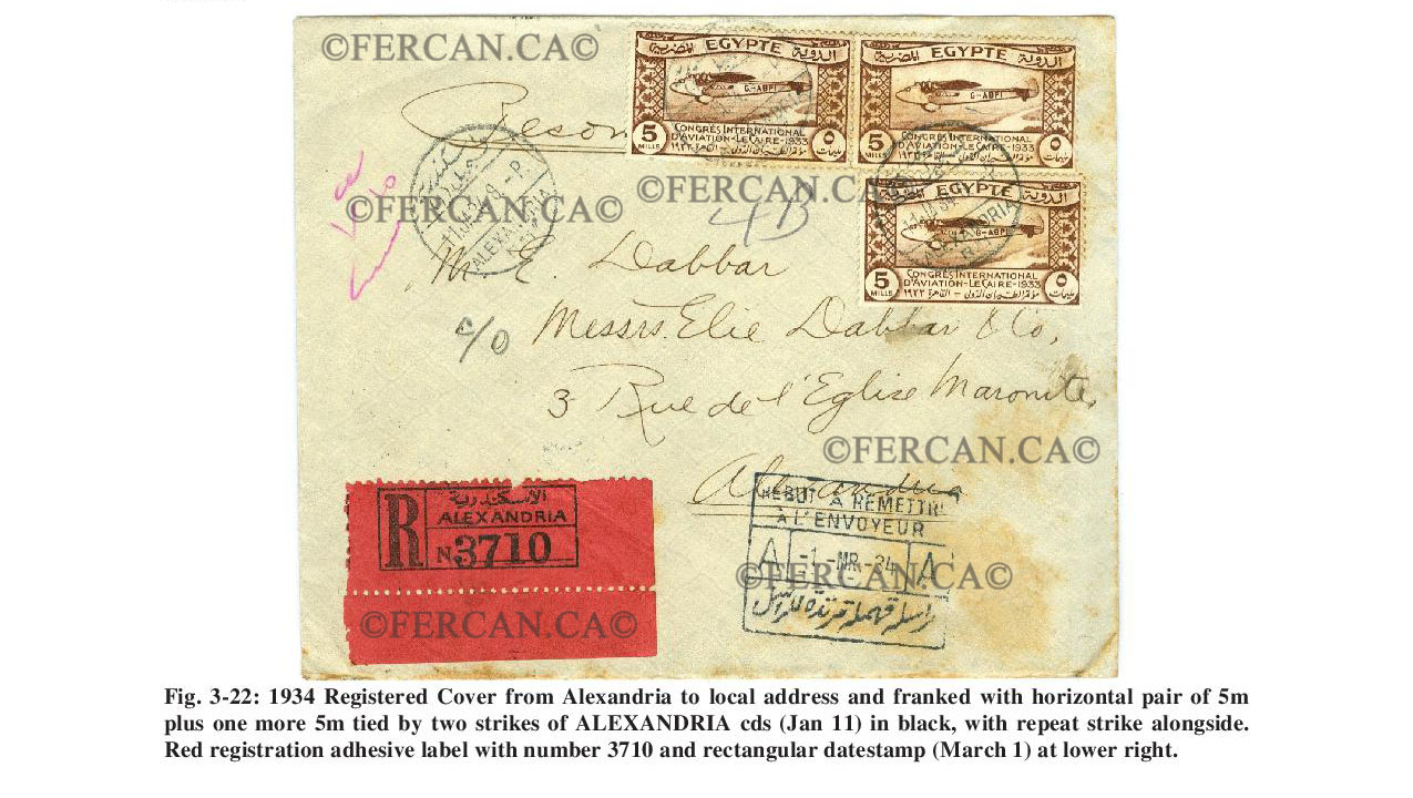 At first, operations were restricted to special flights and hired planes, which started after one year of construction on June 30, 1933 when two new planes had arrived to Al-Maza Airport and became the core of the regular lines. In July 1933, a first line was operated between Cairo and Alexandria. Passengers gathered in the Egypt Tourism office in front of Shepheards Hotel on Ibrahim Pasha Street (Al-Gomhoria Street today) in downtown Cairo. From there, cars transferred them to Al-Maza Airport. This coincided with the Egypt International Aviation Congress on the occasion of which this collection was issued.