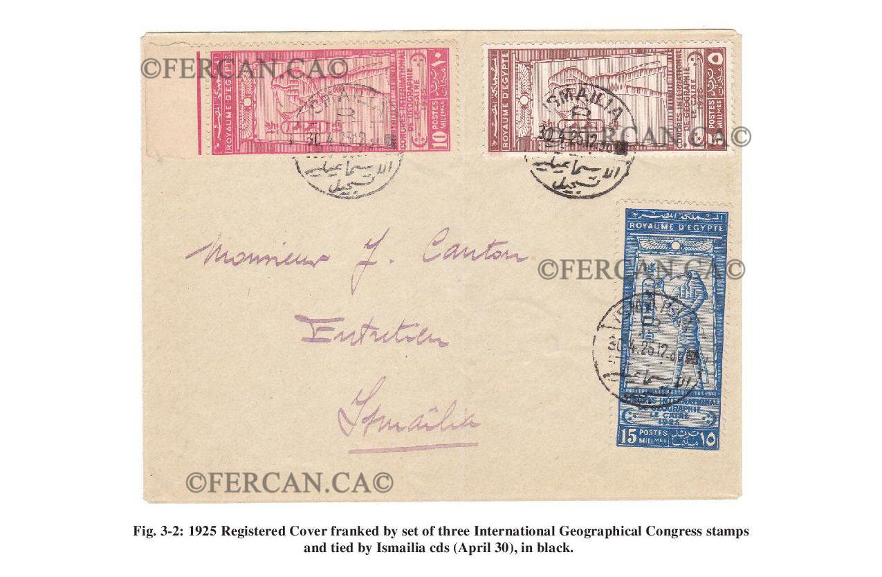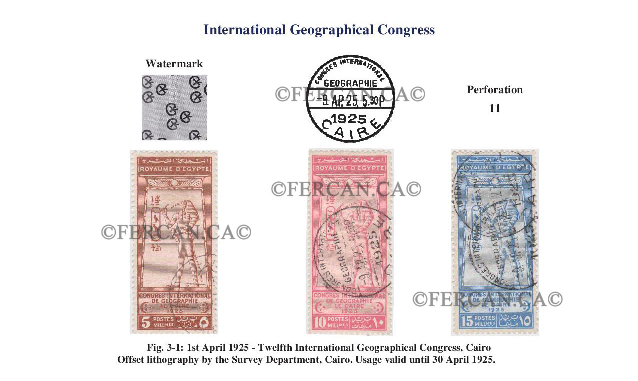 The three-value stamp collection was issued on the occasion of the Twelfth International Geographical Congress organized by the Egyptian Geographical Society in Cairo in 1925. The Egyptian Geographic Society (Arabic: الجمعية الجغرافية المصرية; French: Société de Géographie d'Egypte) was established by a decree of Khedive Ismail Pasha on 19 May 1875. Its first president was the German botanist, traveler and ethnologist Georg August Schweinfurth. Originally founded as the Khedivial Society of Geography, its name was modified several times in order to reflect Egypt's changing political status.